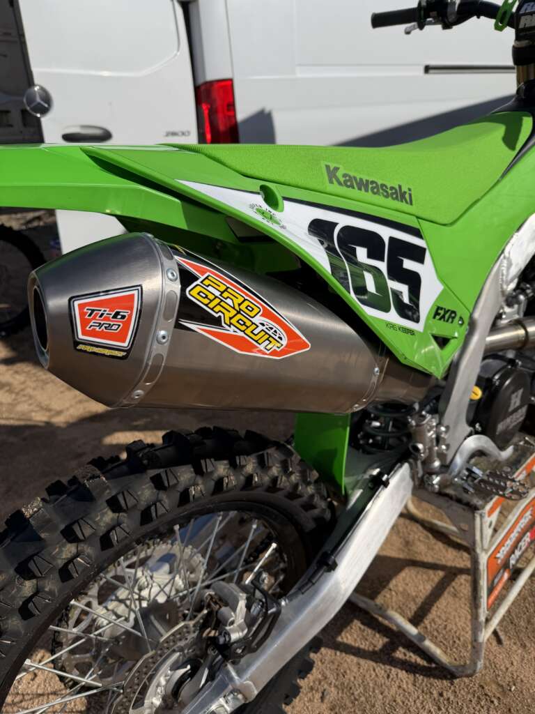 It’s not rocket science that the 2024-2026 Kawasaki KX450 mufflers are plugged up! There is a ton of room for improvement with the engine character with just a slip on. “Kris, it’s a 450, how much power do we actually need”? You would be right, but also there is a fine line of too slow and too fast on 450 machines. The KX450 is super smooth down low which can make the KX450 feel heavy/rich feeling in certain areas of the track (tighter areas). Back in 2024 when this new gen 450 was introduced by Kawasaki it took me a few tracks to be able to feel this, but nonetheless the KX450’s power down low can make the green bike feel heavy in tight corners. Besides drilling holes in the left side cover, this KX450 needs to breathe, so enter Pro Circuit’s Ti-6 Pro “BC” muffler system. PC sent us there new 109db AMA legal “Big Canister”system that is replacing the standard “Ti-6 Pro” with carbon end cap from here on out. This new “BC” muffler is an AMA legal muffler that has a larger canister than the older Ti-6 Pro and incorporates muffler packing within the end cap. The larger canister as well as the packing within the end cap make for a pleasant note. I always preferred the “Pro” model over the regular Ti-6 as the sound as well as performance just felt better to me on the KX450. This is the same type of Pro Circuit system you see on all of the factory Monster Energy/Pro Circuit team riders. This end cap may look like the standard T-6 end cap but it isn’t.